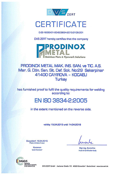 PRODINOX, ISO 3834-2 standardının uygulaması ile; kaynaklı imalatın kontrollü koşullar altında sürekliliğinin sağlanmasını garanti eder.