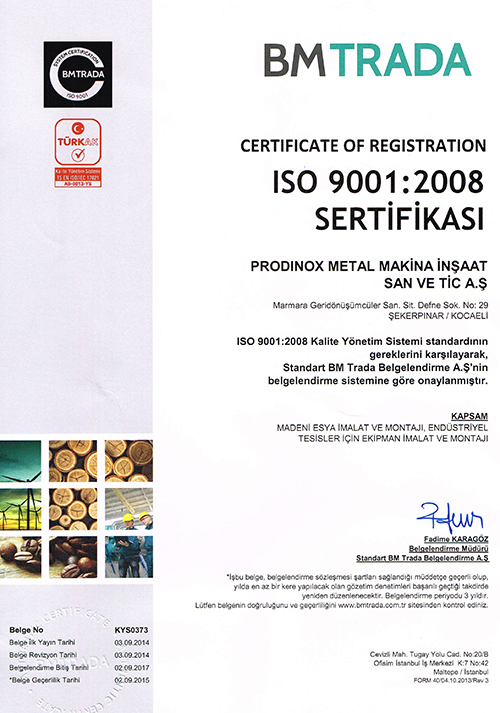 PRODINOX bu bağlamda ISO 9001 standardının yazılı ve uygulamalı tüm mevzuatına uyar ve sitemini sürekli geliştirmeyi hedefler.