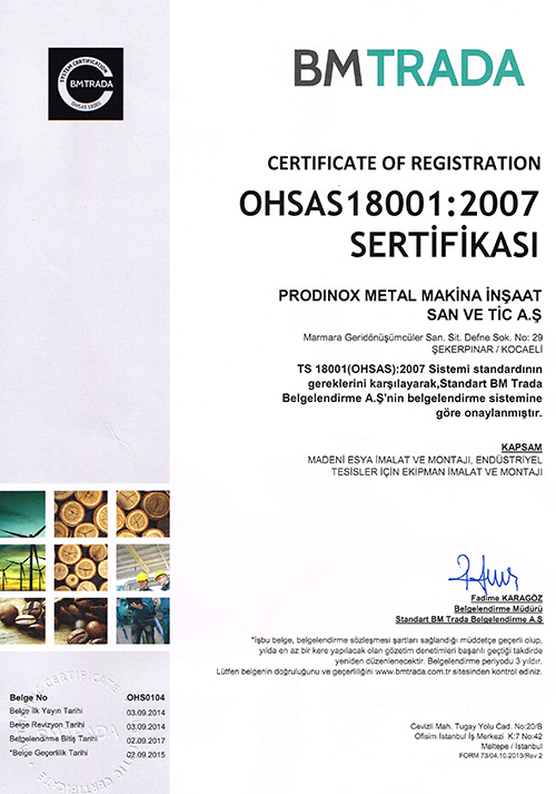 PRODINOX OHSAS 18001’in temel amacı olan; iş sağlığı ve güvenliği ile ilgili yasal mevzuatın ışığı altında, riskleri ortadan kaldırarak veya en aza indirerek, sağlıklı, güvenli bir çalışma ortamı sunar.